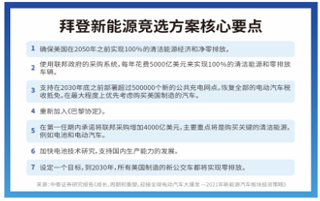 然后最后就是说全球的这种支持性的政策,像中国跟欧洲这边,很明显在发展新能源这个话题上达成了一致协议。我说的新能源是指大新能源,所有都在里面。美国的话,特朗普其实对新能源是不感冒的,但大家看拜登,他的竞选核心方案里面其实涉及到大量的关于新能源的这个东西,拜登上任之后做的第一件事情就是要重返巴黎协议,之后还要增加电动汽车的采购。在没有美国政府支持的情况下,都已经出了全球最牛的新能源汽车公司,而拜登上台之后,会加速整个美国市场的需求,强化美国市场的需求和供应能力。