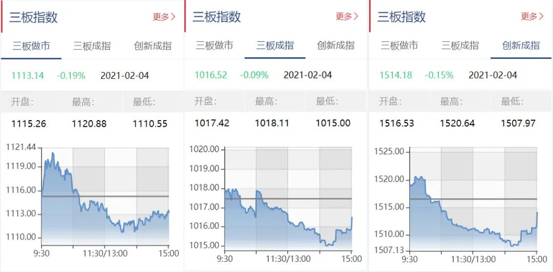 截至2月4日收盘,三板做市报1113.14点,下跌0.19%;三板成指报1016.52点,下跌0.09%;三板创新成指报1514.18点,下跌0.15%。