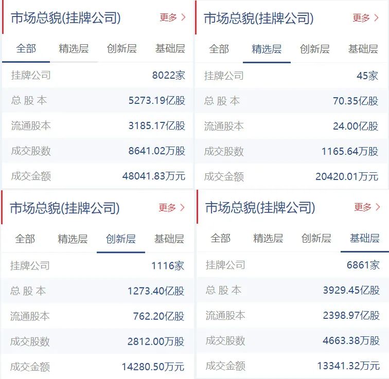 新三板挂牌公司总计8022家(精选层45家,创新层1116家,基础层6861家),总股本5273.19亿股,流通股本3185.17亿股。