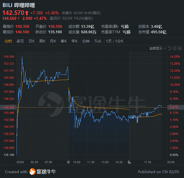 周四快手开启富途暗盘交易,盘中一度涨至266.1%,最终收报336.6港元,较招股价涨192.7%,每手赚22160港元。目前快手总市值达到13828.1亿港元,位列港股第八位。业内人士指出,快手上市或有利于市场对哔哩哔哩(BILI.US)等视频概念股进行重新估值。据早前市场报道,哔哩哔哩已经向港交所正式提交了上市申请,计划3月在港上市,其此次上市保荐团队为摩根士丹利、摩根大通、高盛和瑞银。哔哩哔哩昨日收涨5.46%,盘中股价创历史新高。