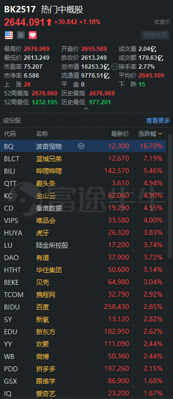 富途热门中概股板块当中,共28只股票收涨,15只收跌。