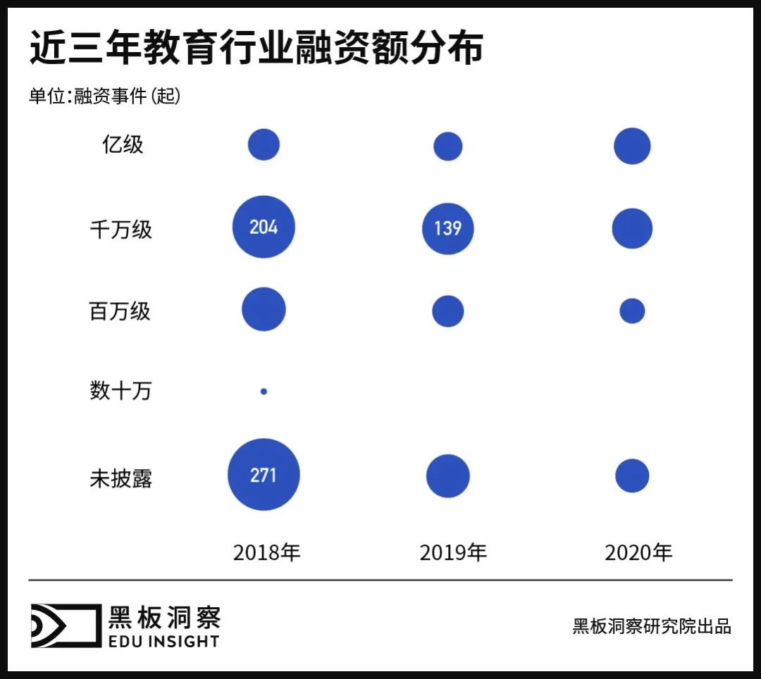从2013年的在线教育元年开始,国内在线教育行业经历了从野蛮生长到理性发展的周期。细数近几年教育行业投融资轮次,早期融资占比已经开始逐年下降,“理清头绪”后的资方开始将更多资金送入各赛道头部机构内,过亿大额融资屡见不鲜。在2020年融资事件数量缩水25.60%的情况下,上亿元融资数量反超2019年同期,融资总额达397.97亿元人民币,占去年全部融资的61.60%。各赛道内融资金额纪录不断被刷新,资本向头部企业大幅度倾斜,教育行业整体呈现“马太效应”。