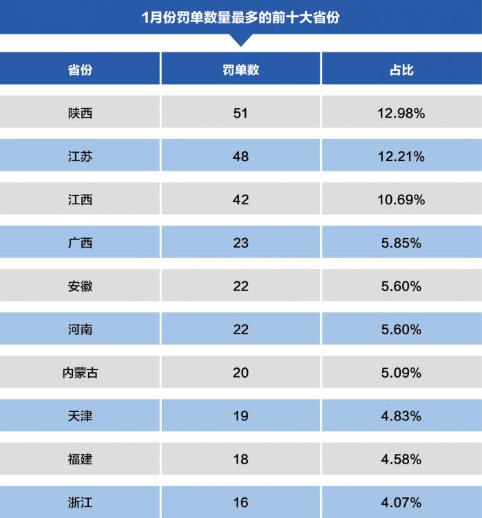 1月份罚单集中分布在哪些区域?经统计,2021年1月份,在393张罚单中,陕西、江苏、江西、广西、安徽五省份银保监局开出的罚单数量合计占比达47.33%,贡献了近一半。具体情况分布如下: