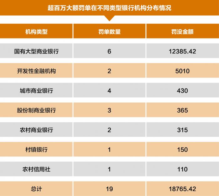2021年1月份,中国银保监会及其派出机构,合计开出100万元以上罚单19张,累计罚款金额18765.42万元,占1月份393张罚单金额的71.77%。其中国有大型商业银行领到的大额罚单最多,合计被罚金额占大额罚单总金额的66%。具体情况如下: