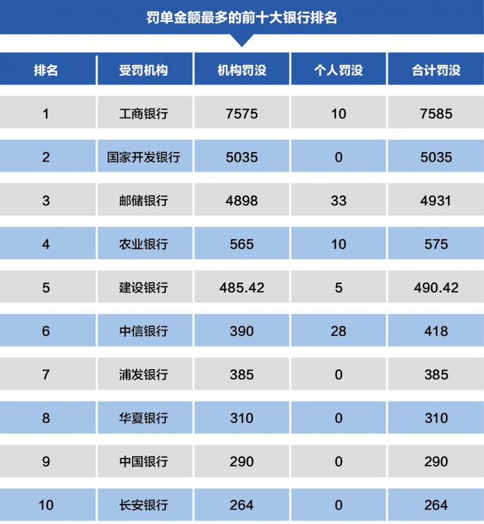 国家开发银行和邮储银行分别以5035万、4931万的累计罚金排第2、第3。被罚金额最多的前十家银行排名统计如下: