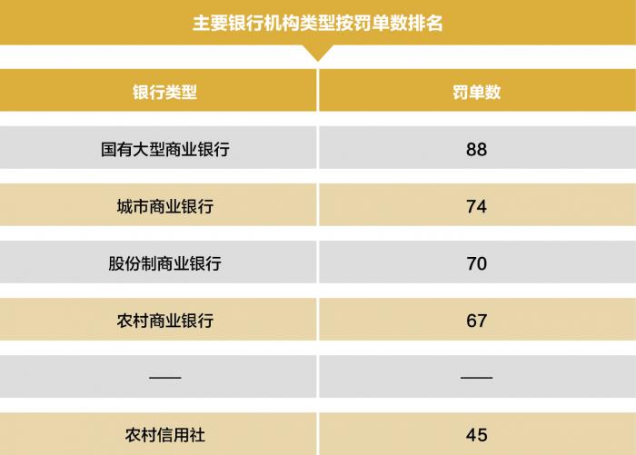 从罚单数量来看,国有大行今年1月份领的罚单数量最多,其次是城市商业银行、股份制商业银行、农村商业银行、农村信用社。