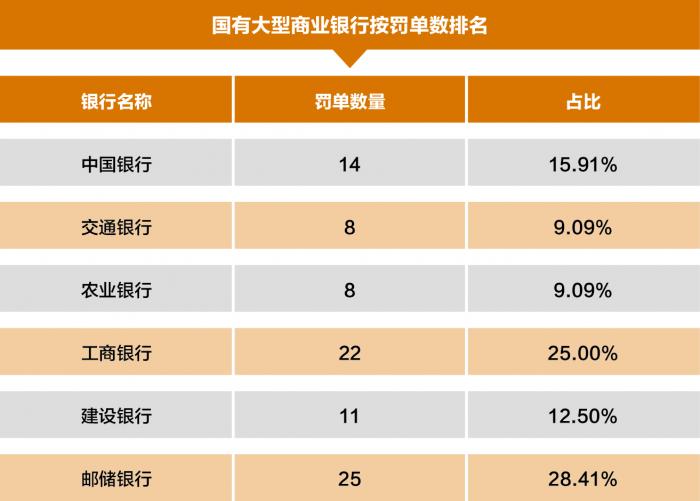 从每一类银行机构领罚单最多的银行来看,今年1月份国有银行领罚单数量最多的是邮政储蓄银行,其次是工商银行、中国银行、建设银行。国有大型商业银行罚单数量前六位情况如下: