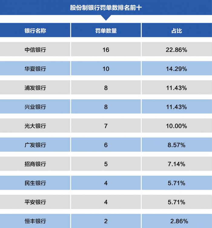 股份制银行中,领罚单最多的是中信银行,华夏银行、浦发银行、兴业银行、光大银行罚单数量也较多。股份制银行罚单数量前十位情况如下: