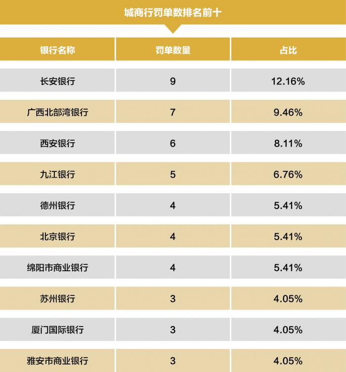 城商行中,领罚单最多的是长安银行,其次是广西北部湾银行、西安银行、九江银行、德州银行、北京银行等。城市商业银行罚单数量前十位情况如下:
