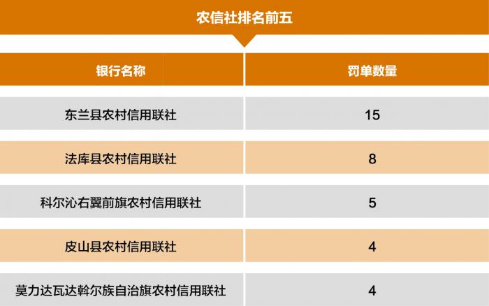 一些农信社因为不规范经营,更是罚单“重灾区”, 广西东兰县农村信用联社今年1月份领了15张罚单。农村信用社罚单数量前五位情况如下: