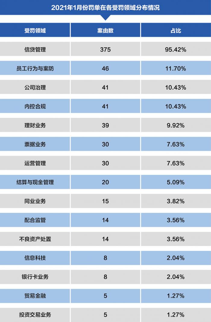 聚焦被处罚事由,2021年1月份银行领到的这393张罚单是由于哪些违规行为?