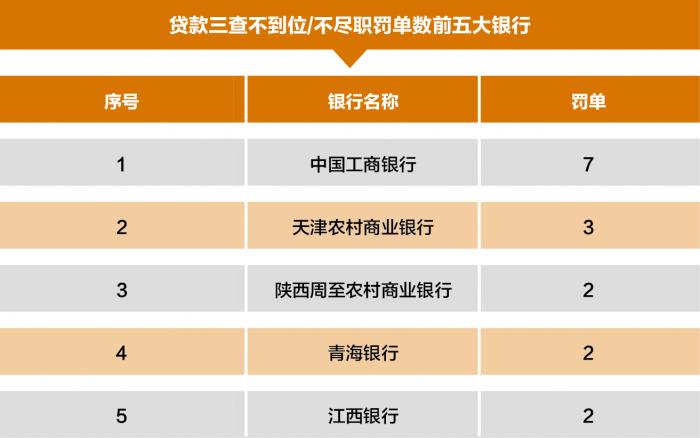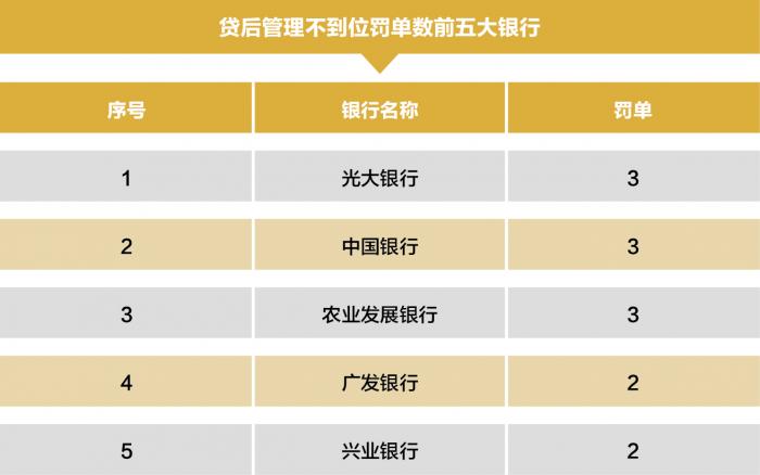 具体细化领域,比如因为贷款三查不到位被罚最多的是中国工商银行、天津农村商业银行、陕西周至农村商业银行等;贷款资金被挪用罚单最多的是平安银行、中国农业银行、邮政储蓄银行;贷后管理不到位罚单最多的是光大银行、中国银行、农业发展银行。
