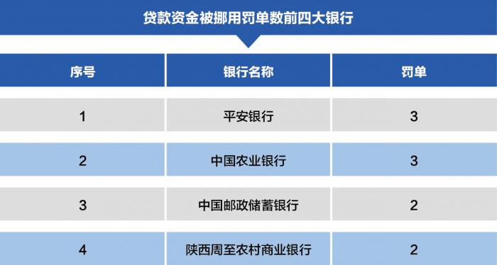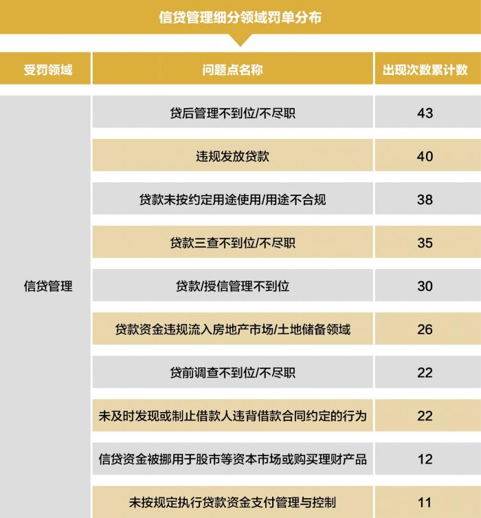 贷款管理不到位、违规发放贷款、贷款未按约定用途使用,以及贷款三查不到位、贷款/授信管理不到位、贷款资金违规流入房地产市场/土地储备领域,这些都是被罚较多的领域。
