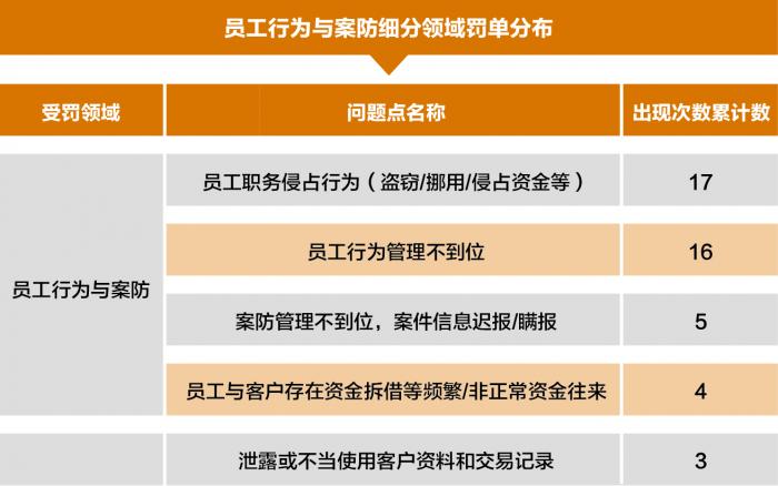 员工行为与案件防范以及内控合规方面的罚单也不少,员工职务侵占行为以及员工行为管理不到位是导致案件频发的原因之一,还有银行发生案件后瞒报,也因此收到了罚单。员工行为不当主要有哪些情形?比如有些银行员工参与民间借贷,还有些私售理财产品、跟客户存在资金拆借等行为。