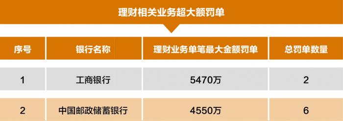 涉及理财业务的罚单虽然数量不多,但不少超大额罚单都是涉及理财业务的。比如工商银行、邮储银行都收到理财业务的超大额罚单,单笔罚单金额分别达到5470万、4550万。银保监会对两家银行的理财业务进行了全面检查,发现了不少问题。相关情况列示如下: