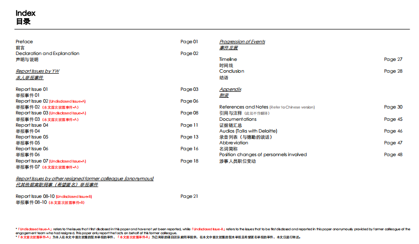 不仅如此,举报者在PPT的前言部分(这份举报PPT非常严谨),就指出本次举报的合理性。最后还有时间线和结论,甚至精心为读者准备附录、引用与注释、证据链汇总、录音列表(与德勤的谈话) 、名词简称、涉事人员职位变动一应俱全。排版之认真,内容之严谨,可以说是金融举报的PPT范本。