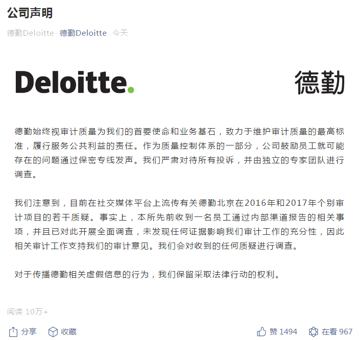 德勤表示,注意到,目前在社交媒体平台上流传有关德勤北京在2016年和2017年个别审计项目的若干质疑。事实上,本所先前收到一名员工通过内部渠道报告的相关事项,并且已对此开展全面调查,未发现任何证据影响我们审计工作的充分性,因此相关审计工作支持我们的审计意见。我们会对收到的任何质疑进行调查。