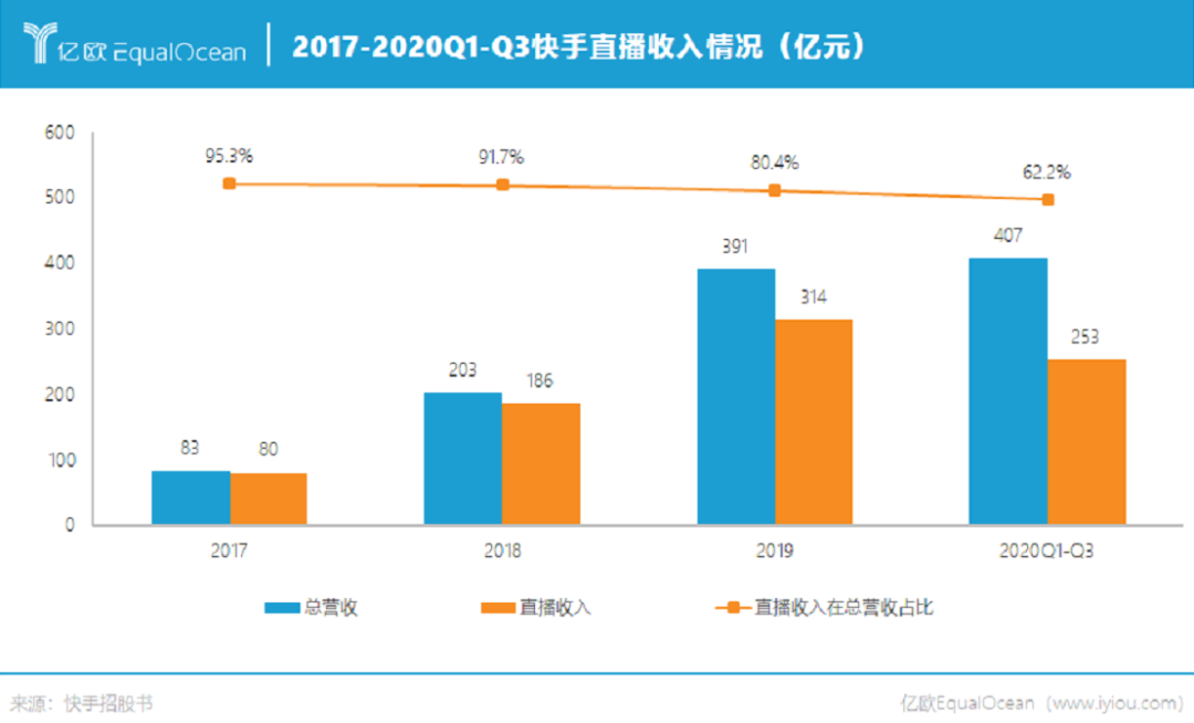 在直播中,主播可通过生活直播、游戏和娱乐直播、带货直播等形式来变现。快手招股书显示,在2017年、2018年、2019年及2020年前9个月中,其直播收入分别占总收入的95.3%、91.7%、80.4%、84.1%及62.2%。