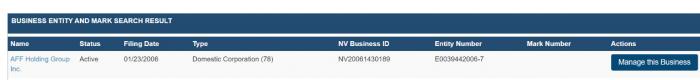 而在其内部宣传PPT上显示,AFF澳丰科技多元金融集团并非其母公司的正式名称,其所谈到的纳斯达克准上市公司的正式名称为“AFF Holding Group Inc”。内华达州商业门户网站搜索结果显示AFF Holding Group Inc 2006年1月23日注册于美国内华达州。