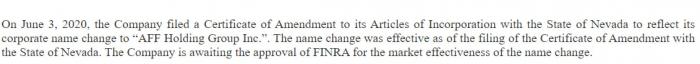 财报还显示,2020年6月3日,公司向内华达州提交了《公司章程》的修订证书,将其公司名称改为“AFF Holding Group Inc”。