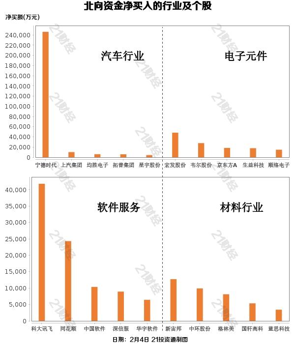 据21投资通(微信号ID:touzit21)智能监测,2月4日,北向资金净买入67.71亿元,其中沪股通净买入10.7亿元,深股通净买入57.01亿元。