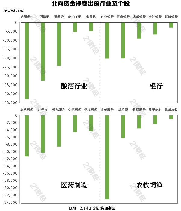 北向资金减持了21个行业,其中酿酒行业最多,净卖出金额达10.94亿元,其次是银行行业,净卖出4.45亿元。