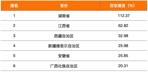 营业收入增速高于全国平均水平(即20%,假设负增长地区增速为0)的省市有6个,包括湖南、江西、西藏、新疆、安徽以及广西壮族自治区,其中湖南省的营收增速保持领先,达到112.37%。