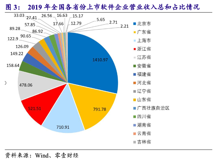 从地域上看,北京市、广东省、上海市等是软件强势地区,这些省市的软件企业营收保持稳中向好态势,部分中西部省市发展快速增长势头不减,营收有望再上一个台阶。注册地的上市软件公司软件业务收入总和居前五名的省市北京、广东、上海、浙江、江苏共完成收入3913.23亿元,占全国软件业比重的78.98%。