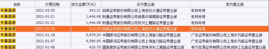 类似的还有长春高新,今年以来共发生7笔大宗交易。其中,卖方营业部为机构专用席位的共有4笔,成交金额合计为3349.62万元。