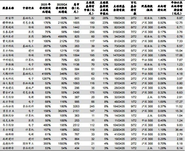 据国信证券统计,共有29家公司满足以下三个条件:第一,2020年净利润同比增速、2020第四季度净利润同比增速均高于50%;第二,权益仓位 60%以上的主动权益基金总计持有市值超过10 亿元,并且有百亿基金持有;第三, 1月份获得北向资金加仓。