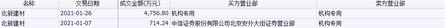 1月7日,北新建材总成交16万股,成交金额714.24万元,为机构账户卖出,当日大宗交易成交金额占当日成交金额1.06%,成交价与收盘价持平。
