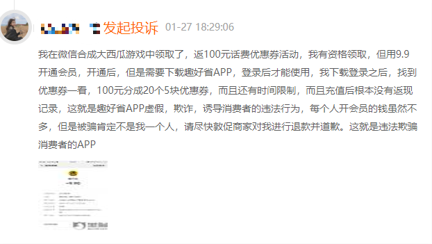 值得注意的是,类似的“100元话费券”事件在《合成大西瓜》中已经不是第一次发生。有牛财经查阅黑猫投诉平台发现,一名玩家在游戏中领取百元话费券后,被提示“需要用9.9元开通小魔卡会员”,同时还要下载一款名为“趣好省”的App,登录后才能使用。但该用户登录趣好省后,发现100元话费券被分成了20张5元优惠券,而且还有时间限制。