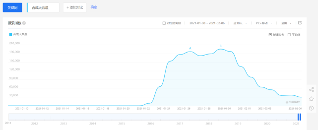 但这种游戏的缺陷也很明显——产品单一的玩法和简陋的内容使它们无法长期吸引用户,这一点导致行业内产品迭代速度极快,几乎没有一款小游戏能在Top行列保持太长时间。当年火遍全国的《跳一跳》、《旅行青蛙》皆是如此,就连《合成大西瓜》这只当红炸子鸡,生命力也在日渐消逝。百度指数显示,《合成大西瓜》的搜索指数在1月29日达到顶峰(195485)后一路下跌,截至2月6日,其热度已跌至29567,尚不及峰值的六分之一。