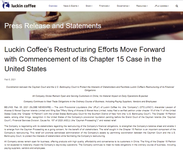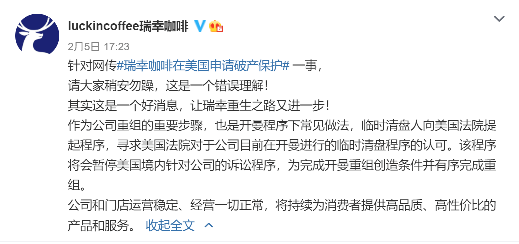 2021年2月5日,瑞幸咖啡发布公告称,瑞幸咖啡联合临时清算人已经在美国申请了破产保护。