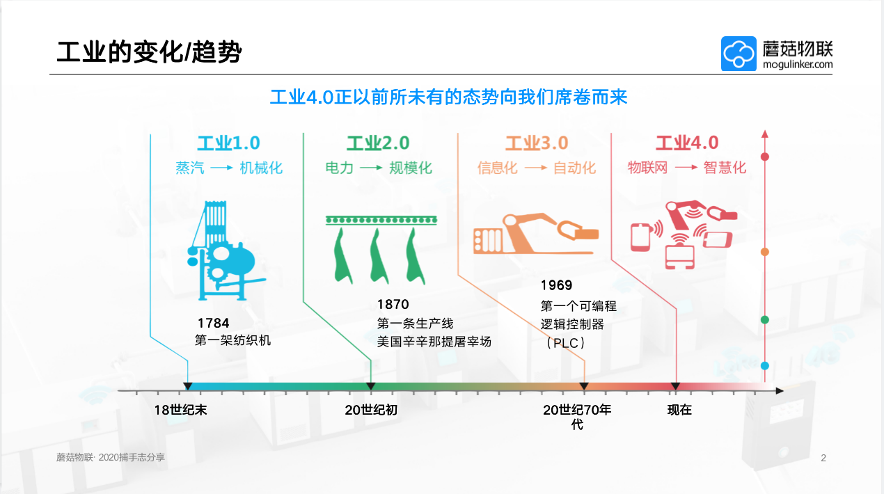 首先,工业发展至今一共经历了四个阶段,第一个阶段工业1.0时代,开始于18世纪末的第一架纺织机的诞生,我们从蒸汽时代进入到了机械化时代;第二个阶段工业2.0时代,开始于20世纪初美国辛辛那屠宰场第一条生产线的投入,预示我们拥有了规模化生产能力;第三个阶段工业3.0,开始于1969年的第一个可编程逻辑控制器(PLC),让我们从信息化步入自动化时代;第四个阶段工业4.0,也就是工业互联网阶段,我们将由物联网进入智能化。