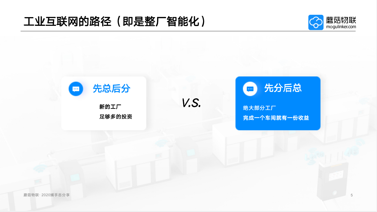第二种是先分后总,这也是整个工业互联网的最大路径。首先,制造业是一个存量远远大于增量的市场,大概相差十五倍以上;其次,中国制造业的迅猛发展开始于2001年加入WTO,大部分工厂也都在2010年建完,发展至今,原来建工厂的设备投资在财务报表里已经被摊销掉了,它没有积极性一定要去换全新的设备、产线和新的系统;最后先总后分成本太大、风险也高。所以,先分后总的发展路径很好的帮企业规避了大量的成本和风险。