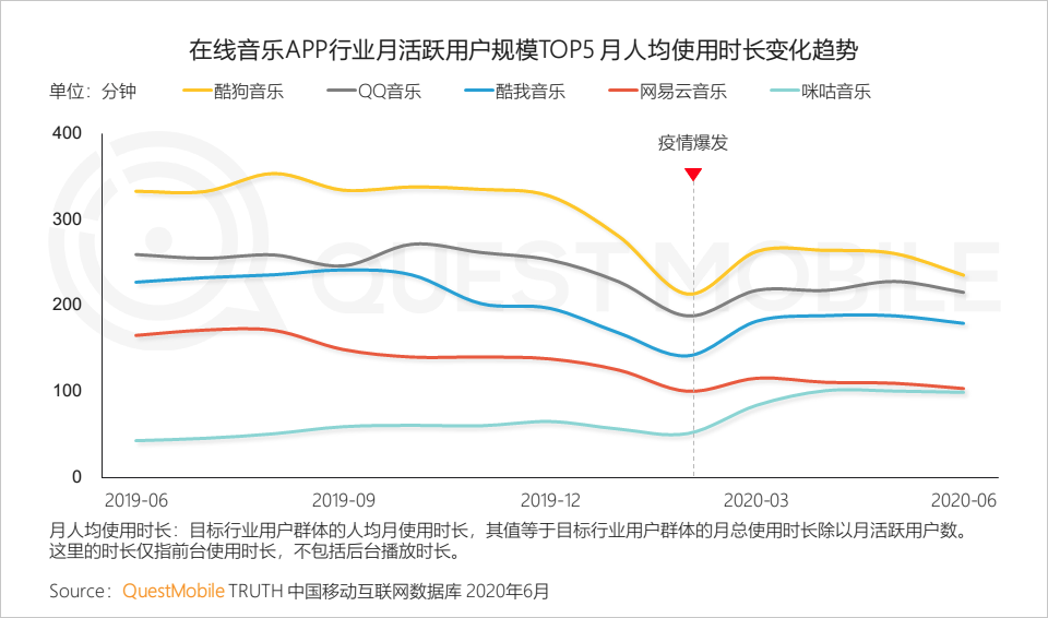 从QuestMobile的数据能看出,去年疫情爆发后,各大音乐平台的月活都显著下滑。