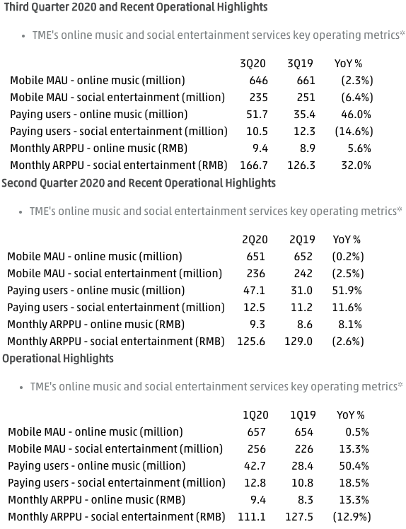 根据TME去年前三季度财报,以全民K歌为主力的娱乐服务收入分别为42.7、47.1和52.5亿元,环比增幅从9%提高至11%,2020Q3的ARPPU同比增长32%。