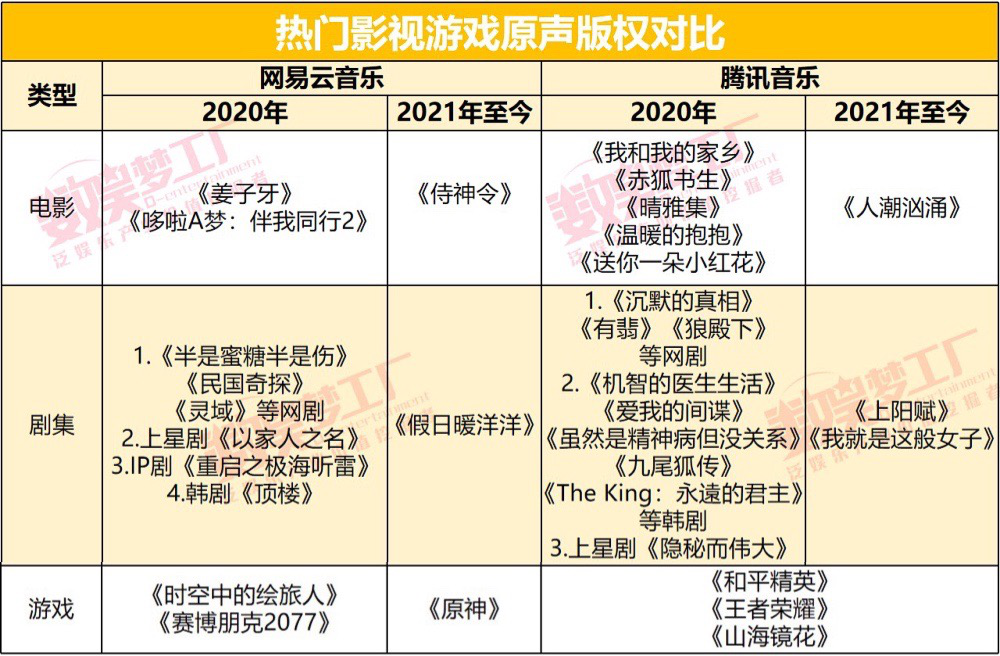 对于网剧、韩剧、电影甚至是游戏的音乐版权,只要是热门文娱内容,双方都没有放过。