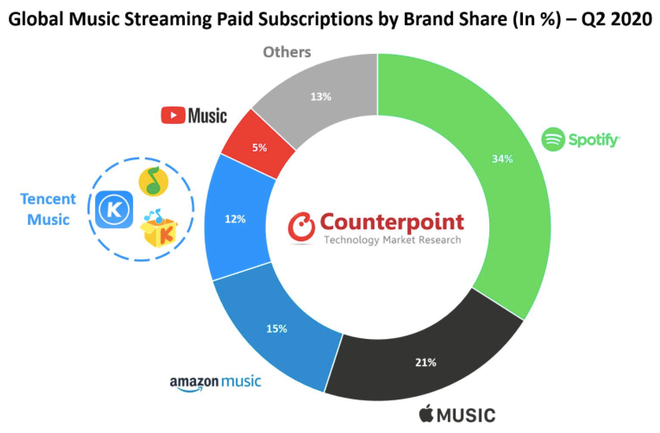 放眼全球音乐流媒体市场,来自瑞典的Spotify一家独大,Apple music、Amazon music紧随其后。