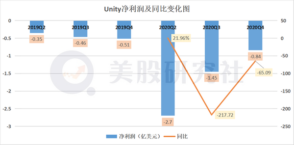 在净亏损方面,本季度Unity的亏损还在继续。2020Q4季度净利润亏损8350.2万美元,相比于上一季度亏损1.45亿美元同比下滑65.09%。
