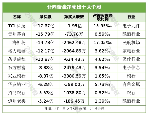 北向资金净卖出TCL科技、贵州茅台、上海机场、格力电器、药明康德居前。其中,本周TCL科技被北向资金累计净卖出17.67亿元居首。2月5日TCL科技跌停,龙虎榜数据显示,北向资金位居买一、卖一席位。