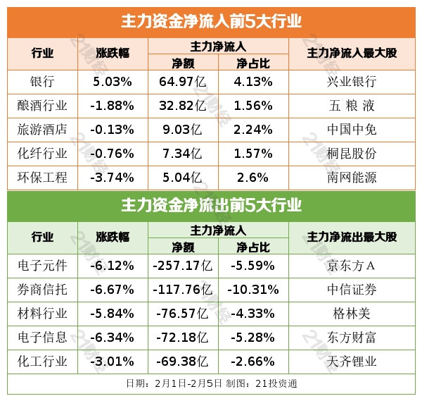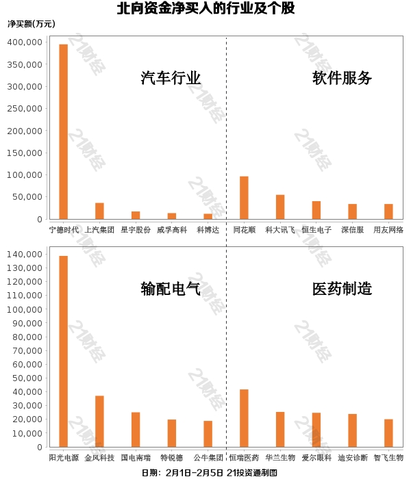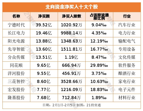据21投资通(微信号ID:touzit21)智能监测,2月1日至2月5日,北向资金累计净买入达253.26亿元。