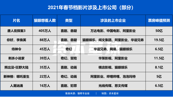 至此,包括阿里、腾讯、美团、网易等互联网上市公司均出现在今年春节档,猫眼娱乐和哔哩哔哩等本身就和影视业务相关的公司也没有缺席。