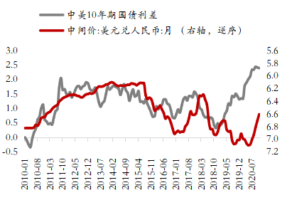 由于疫情期间美国政府实施了史无前例的宽松政策,美联储资产负债表大幅扩张,相较美联储,中国央行仍维持正常的利率政策。从中美10年国债利差来看,中国国债收益率吸引力明显,预计人民币兑美元将延续强势,全年波动范围在6.2-6.7左右。