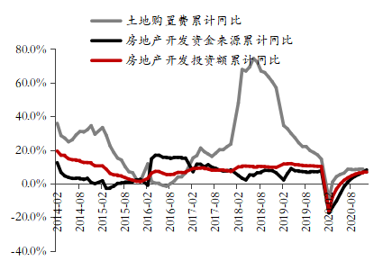房地产开发投资增速的变化主要由供给端和需求端两方面共同决定。其中供给端主要包括土地供给,需求端包括房地产开发资金。从历史数据上看,房地产投资与房地产开发资金、土地购置费具有较明显的一致性,当资金来源和土地购置费增速上升时,投资增速往往也会随之明显出现上升。国家统计局数据显示,2020年,房地产开发资金来源累计同比增长8.1%,土地购置费累计同比增长6.7%,预计2021年房地产开发投资全年同比增速在7%左右。