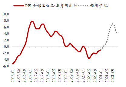 2021年全球经济同步复苏,工业品价格可能回升,预计2021年PPI同比增速将在一季度开始回正,在三季度升至年内高点后逐步回落,全年同比增长3.8%左右。