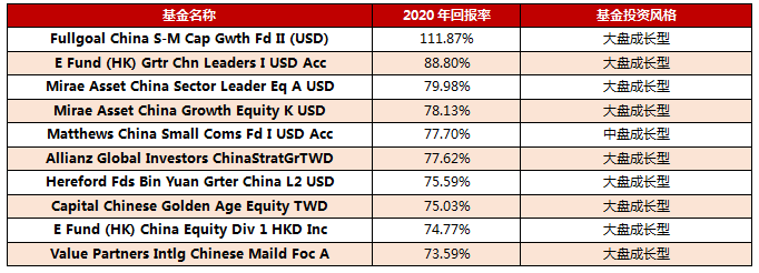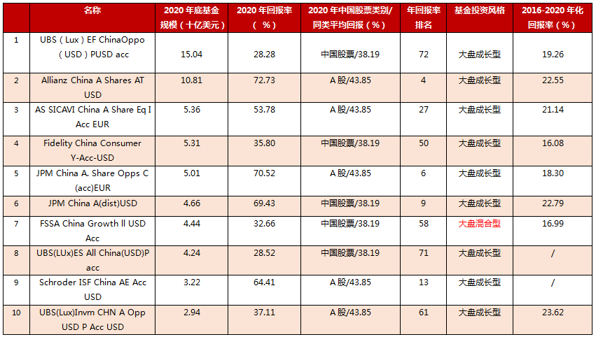 2020年规模排名前十的海外中国股票基金的资产管理规模与业绩