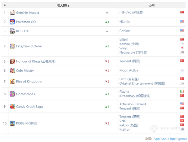 厂商收入排行方面的马太效应依旧明显,腾讯和Playrix稳居前二,Zynga和韩国的Netmarble坐稳第5和第6,11月排在第4位的网易和第3位的动视暴雪上演位置交换。手游领域的各个头部玩家优势明显,在全球的用户规模都较大,这对于动视暴雪压力不小。