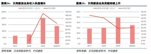 2017年-2019年,贝壳新房业务的收入从64.2亿元增长至202.7亿元,年均复合增速77.7%,尤其是在2019年取得了跨越式增长,新房业务占贝壳营业收入比重也提升至了2019年的44.1%,到2020年6月底,新房业务占比超过二手房业务达到51.3%。